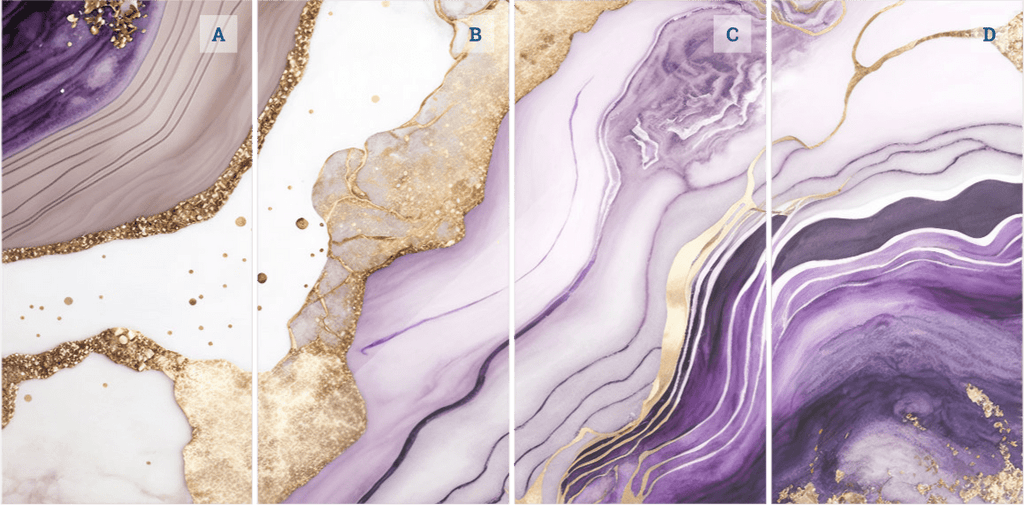 Amethyst Gem have beautiful panels in a swirling design in white with beautiful purple and gold throughout. Each panel is sized at 1.2m width x 2.4m height.