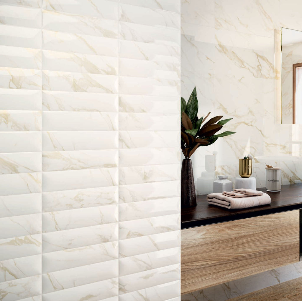 Giallo Gold is a stylish ceramic wall tile which come in white hues and has beautiful gold veining throughout in a marble-effect design. Oozing style and sophistication, this tile can be used as a kitchen splashback, as a feature wall in bathrooms or as a shower wall.