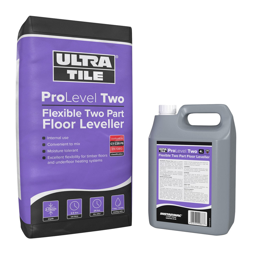 UltraTile ProLevel Two is a mid-strength smoothing underlayment. A two-component system consisting of a powdered blend of cements, graded fillers and additives, and a pre-gauged polymer liquid. Tiles can be applied to the internal subfloors in as little as 24 hours and its fast set time enables light foot traffic in 2.5 hours.