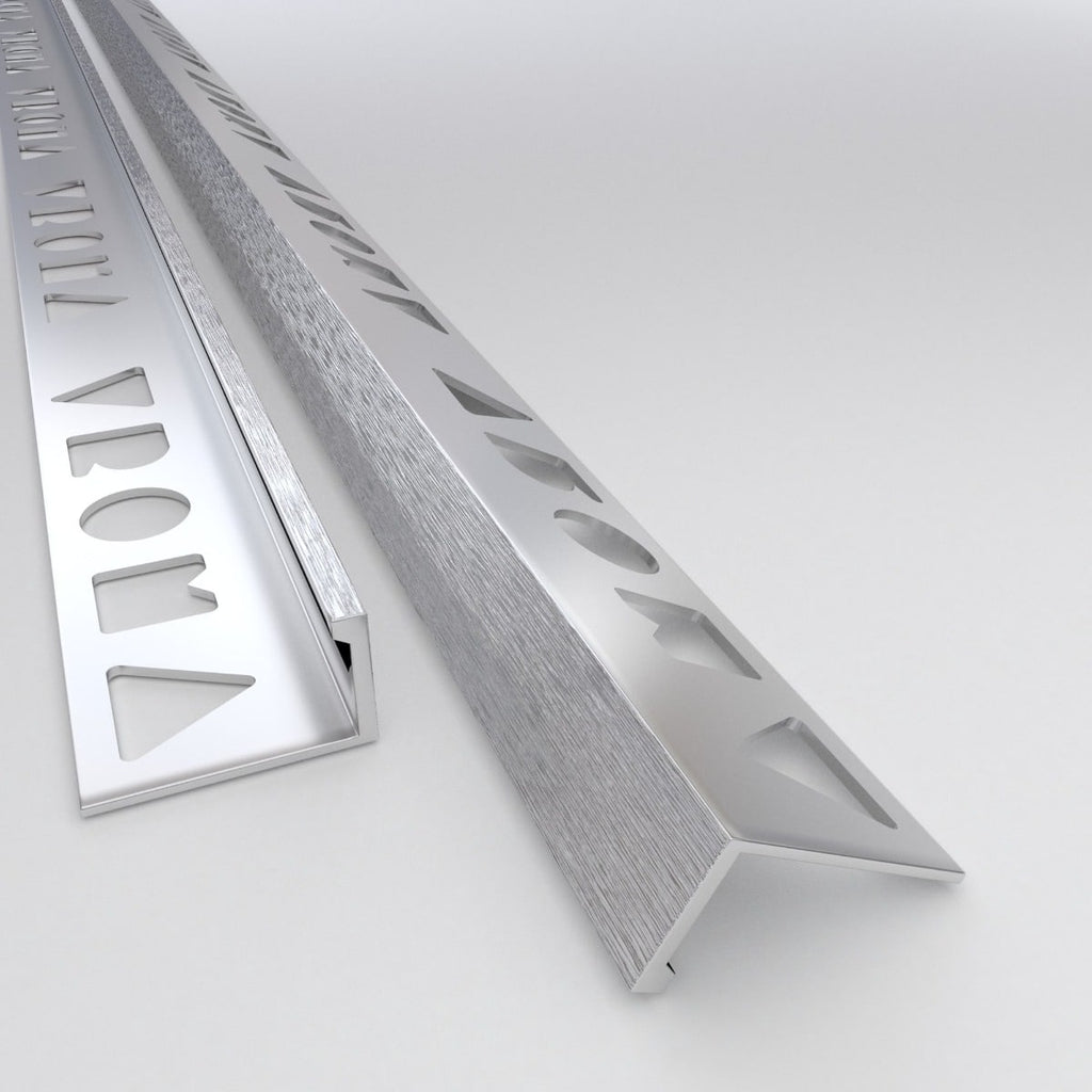 Premium L-shaped tile trim in bright silver finish, perfect for creating clean, professional edges on your tiling projects. This versatile trim protects tile edges while adding a sleek, modern aesthetic to walls and floors.